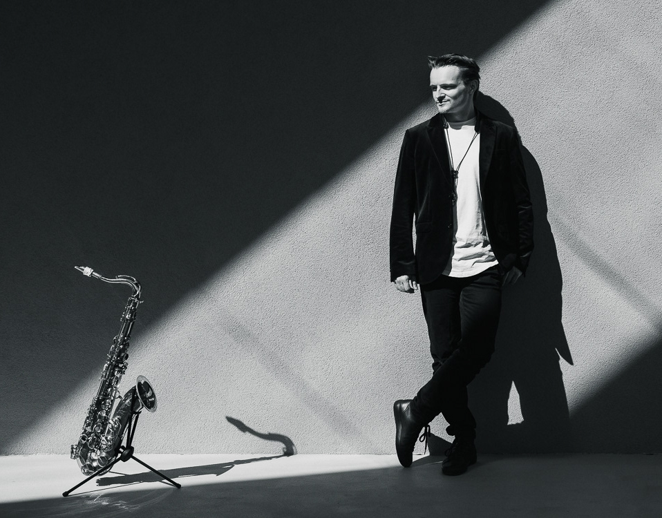 Promo fotenie pre hudobníka Jána Kopčáka s jeho saxofónom.